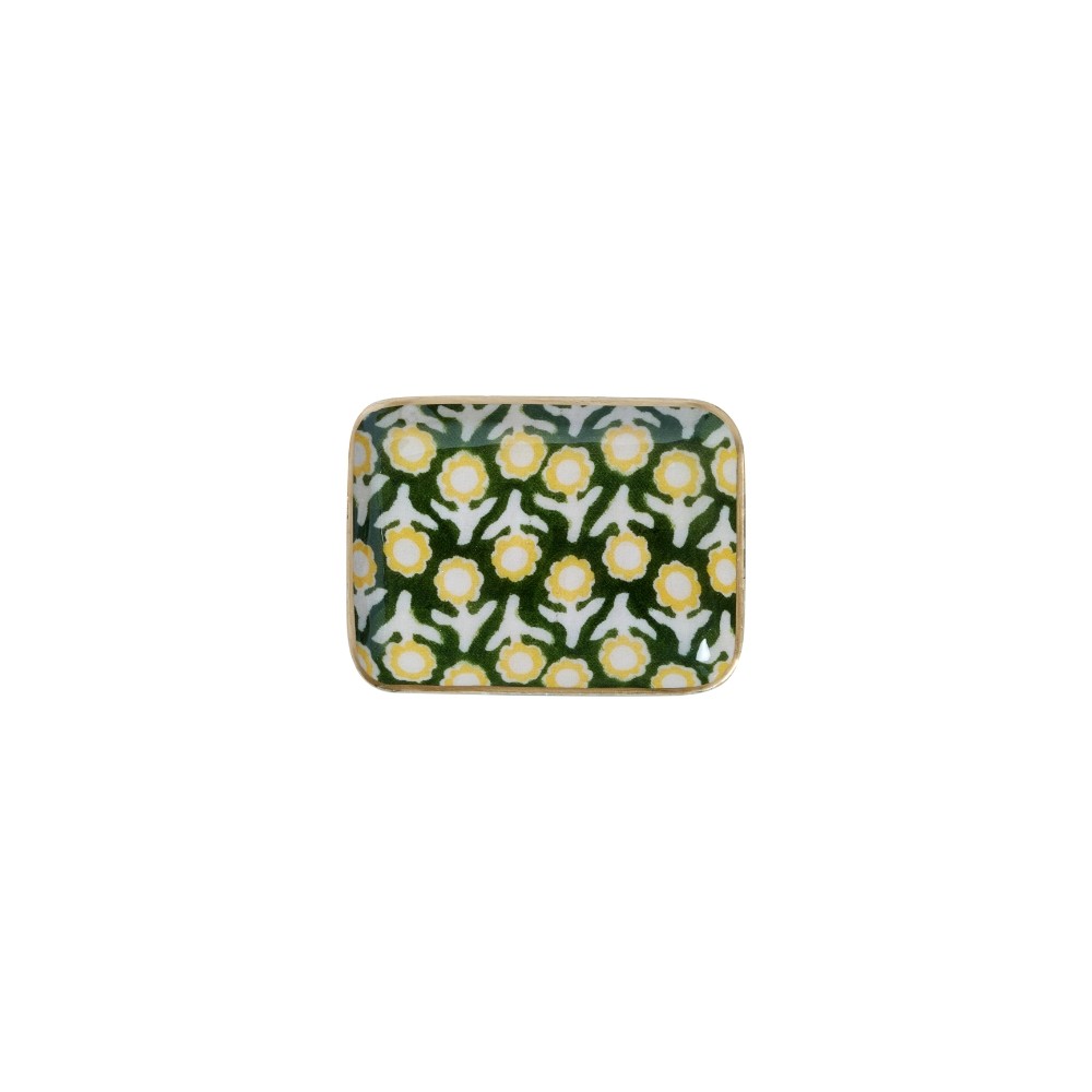 Bandejas diseñadas en metal esmaltado con un borde dorado a mano. Es una pieza única, moldeada por las manos de artesanos indios, lo que le confiere irregularidades.
